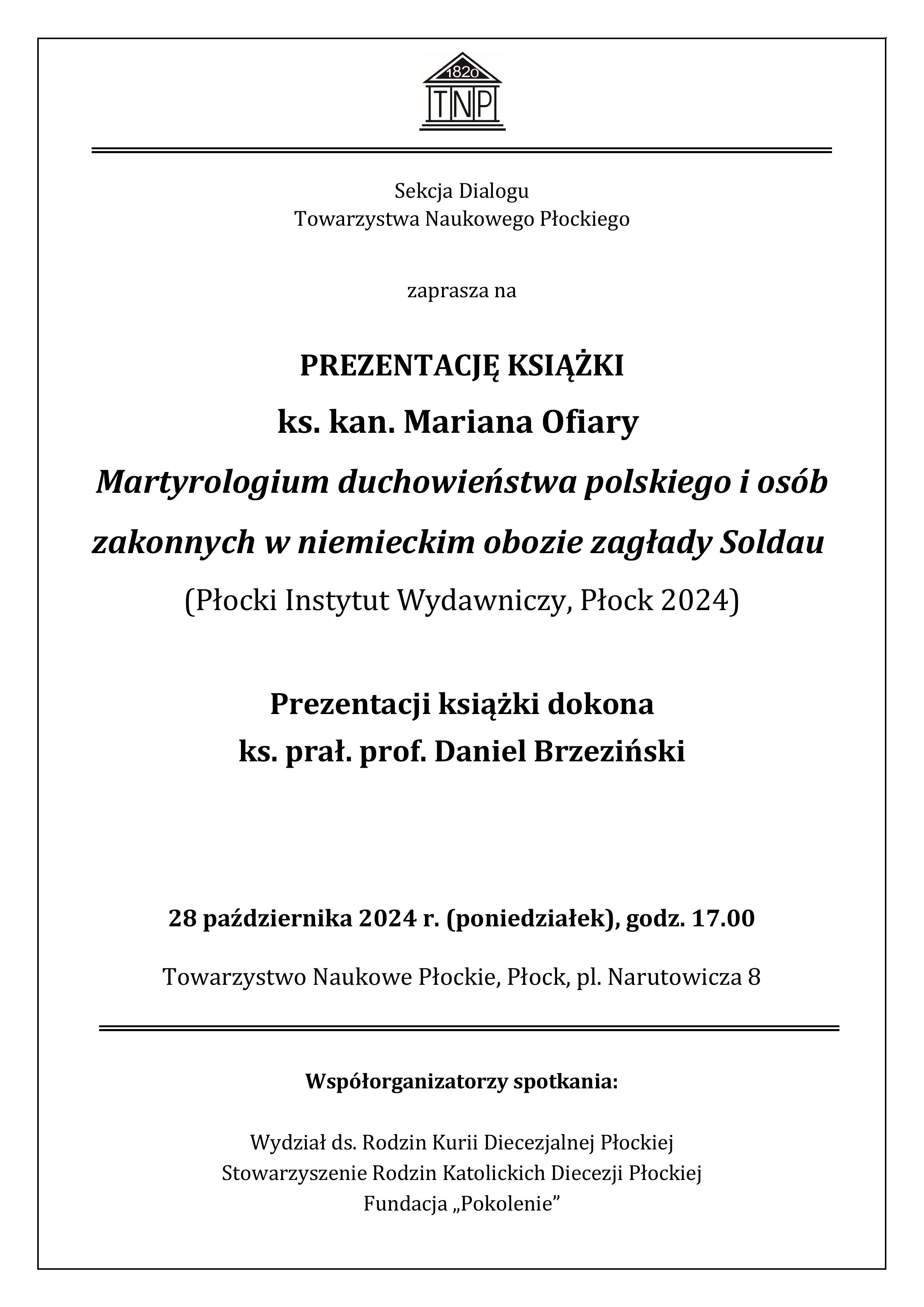Prezentacja książki ks. kan. Mariana Ofiary pt. Martyrologium duchowieństwa polskiego i osób zakonnych w niemieckim obozie zagłady Soldau (28.10.2024)